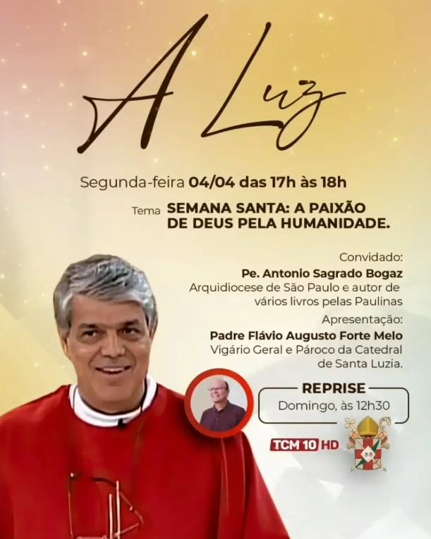 Padre Antônio Bogaz é autor de vários livros e estará nesta segunda-feira a partir das 17h no programa A Luz da Diocese pela TCM 10 HD. Acompanhe!