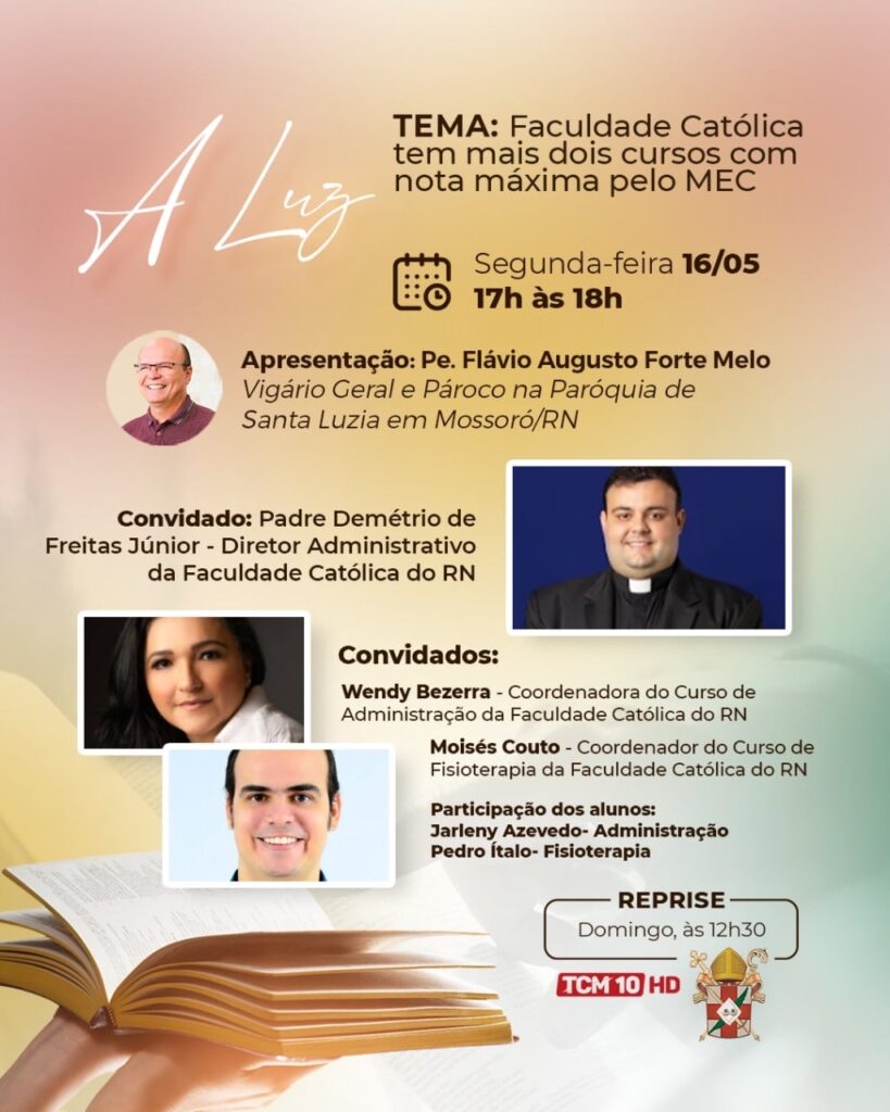 Cursos de Administração e Fisioterapia da Faculdade Católica do Rio Grande do Norte conquistam nota máxima em avaliação do MEC. Conheça os detalhes hoje, segunda-feira a partir das 17h, pela TCM Telecom, programa A Luz da Diocese de Mossoró.