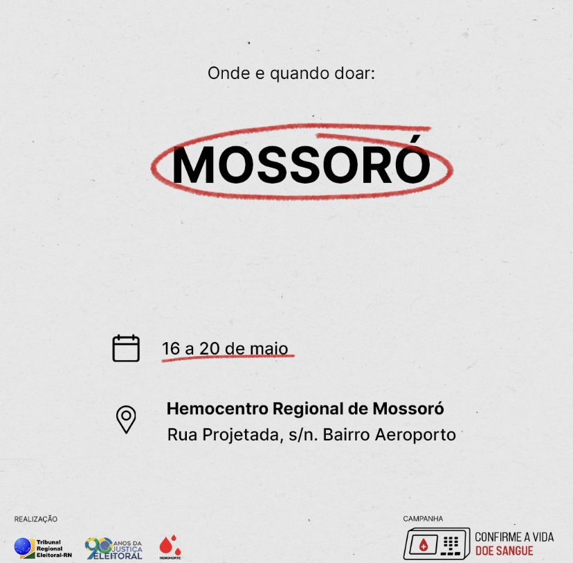 As doações podem ser feitas de 16 a 20 de maio no Hemocentro Regional A segunda etapa da campanha “Confirme Vida. Doe Sangue” começa na próxima segunda-feira (16) em Mossoró. A ação realizada pelo Tribunal Regional Eleitoral do Rio Grande do Norte (TRE-RN), em parceria com o Hemonorte, tem como objetivo incentivar a doação e […]