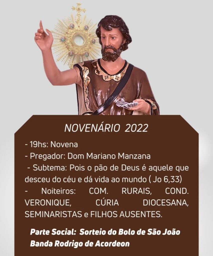 O nosso bispo diocesano Dom Mariano Manzana é o pregador de hoje da última Novena de São João Batista 2022, que ocorre no bairro Doze Anos aqui em Mossoró. A novena será transmitida pela Rádio Rural.