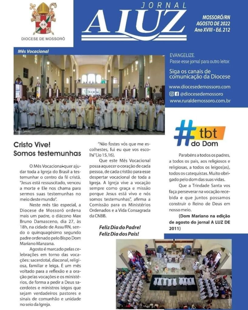 Jornal “A LUZ” da Diocese: é sempre com imensa alegria que, agradecendo aos muitos colaboradores, oferecemos as edições do jornal diocesano, mesmo que de forma virtual. Neste mês de agosto, o destaque é para as várias vocações dentro da Igreja: do padre, dos pais, dos religiosos e religiosas, dos leigos, destacando no quinto domingo, quando […]