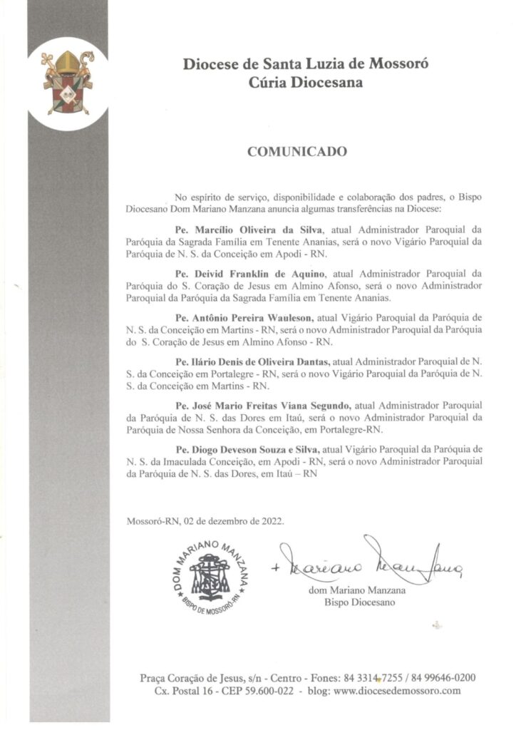 A Igreja Diocesana cumpre a sua missão por meio da harmoniosa cooperação entre presbíteros e Bispo no serviço ao povo de Deus; a dinamização da pastoral passa pela alternância dos párocos, administradores e vigários paroquiais. Somos servidores da Diocese formada por um conjunto de paróquias e comunidades que sempre espera o gesto de obediência ao […]
