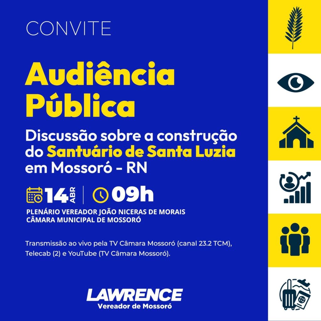 Audiência pública, às 9h, no plenário, reunirá diversos segmentos Autoridades políticas e religiosas, entidades do turismo e de classes confirmaram presença na audiência pública, nesta sexta-feira (14), às 9h, na Câmara Municipal de Mossoró, sobre a construção de santuário de Santa Luzia no município. Proposta pelo presidente da Casa, Lawrence Amorim (Solidariedade), a reunião discutirá […]