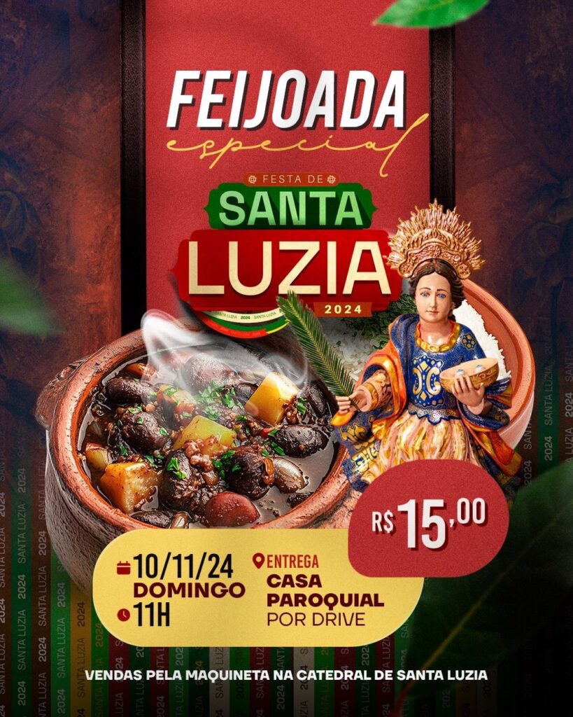 Neste domingo, 10 de Novembro, acontece a Feijoada de Santa Luzia, a partir de 11h, na Casa Paroquial, que fica em frente a Catedral, vizinho a agência do Banco do Brasil. Será em formato drive-thru. As vendas dos bilhetes já são feitas na Secretaria da Catedral. A Festa de Santa Luzia 2024 será de 1º […]