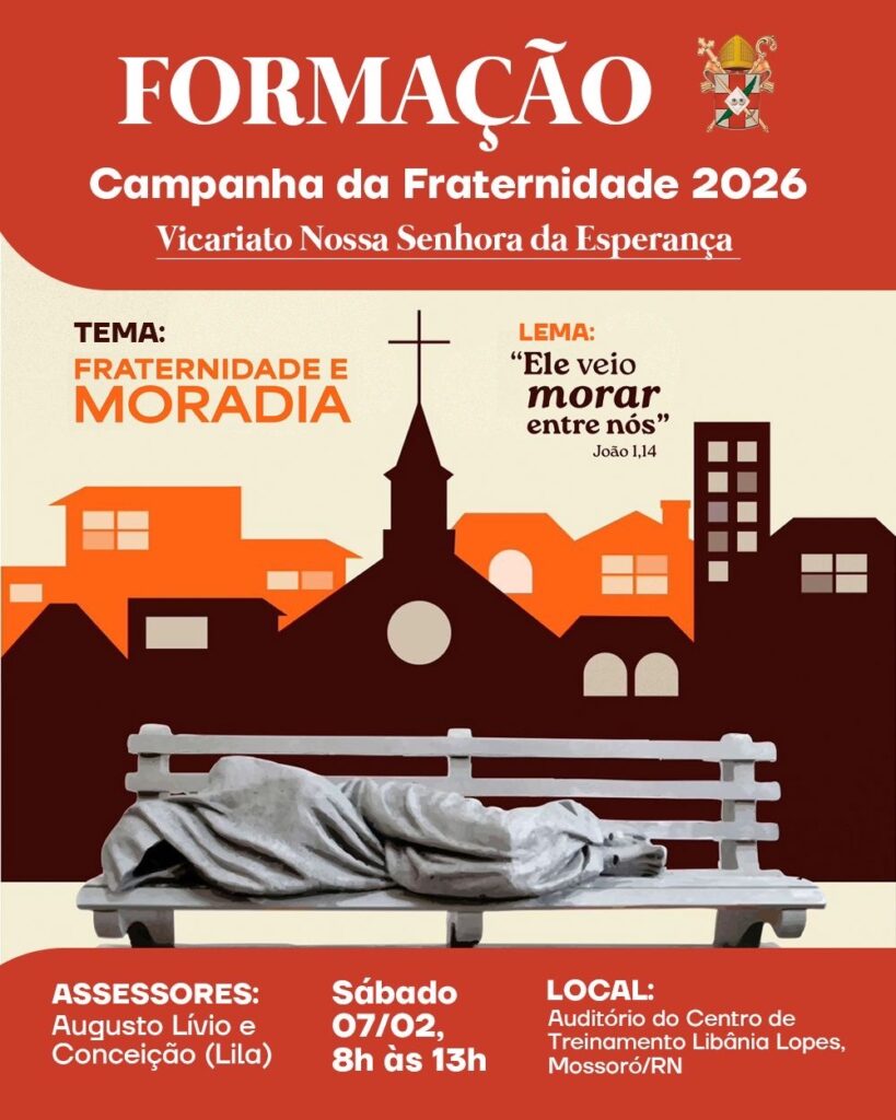 A Diocese de Mossoró, por meio do Vicariato Nossa Senhora da Esperança, realizará no próximo sábado, 7 de fevereiro, uma formação dedicada à Campanha da Fraternidade 2026, que tem como tema “Fraternidade e Moradia” e como lema “Ele veio morar entre nós” (Jo 1,14). O encontro acontecerá das 8h às 13h, no Auditório do Centro […]