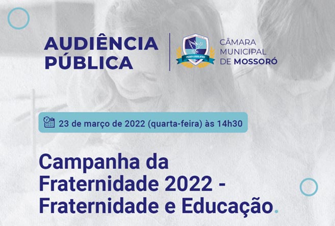 Com proposição do vereador Costinha (MDB), a Câmara Municipal de Mossoró vai realizar uma audiência pública com o tema da Campanha da Fraternidade de 2022. A audiência acontecerá no dia 23 de março, quarta-feira, às 14h30, no plenário do Poder Legislativo. Este ano, o tema escolhido foi educação. Está é a terceira vez que a […]