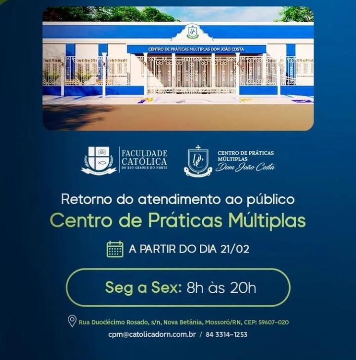 Com o início do ano letivo de 2022, as atividades do Centro de Práticas Múltiplas Dom João Costa, instituição vinculada à Faculdade Católica do Rio Grande do Norte, voltam a funcionar a partir da próxima segunda-feira, dia 21 de fevereiro. Para o semestre 2022.1, as atividades presenciais retornam plenamente, de segunda a sexta-feira, das 08h […]