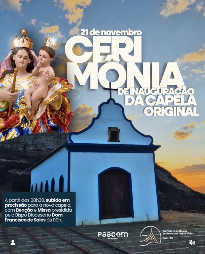 A comunidade de Patu (RN) e devotos de diversas regiões vivem um dia especial nesta quinta-feira, com a realização da cerimônia de inauguração da Capela Original do Santuário de Nossa Senhora dos Impossíveis. O momento marca um importante capítulo na história e na devoção ao santuário. A programação tem início hoje, 21 de novembro, às […]