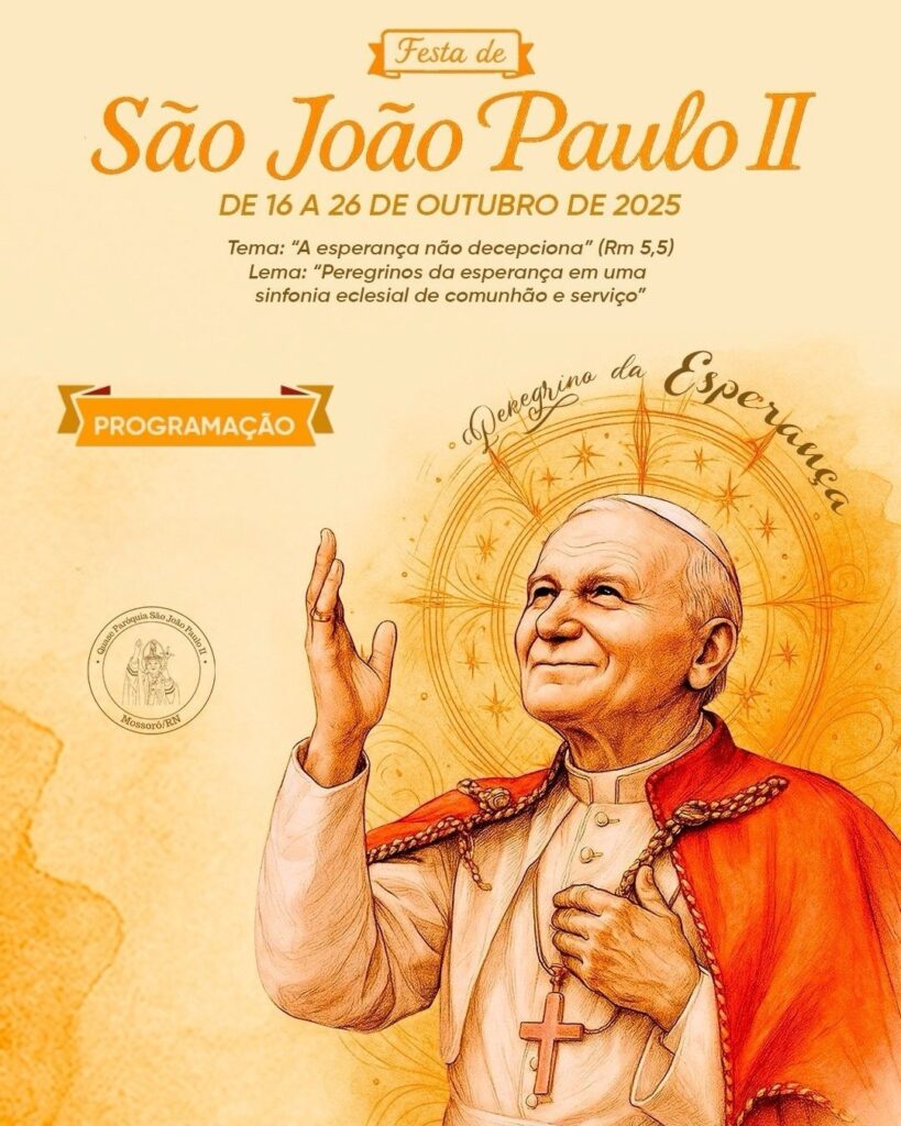 A Quase Paróquia São João Paulo II se prepara para celebrar, de 16 a 26 de outubro de 2025, a tradicional Festa de São João Paulo II, que neste ano traz o tema “A esperança não decepciona” e o lema “Peregrinos da esperança em uma sinfonia eclesial de comunhão e serviço”. A programação oficial tem […]