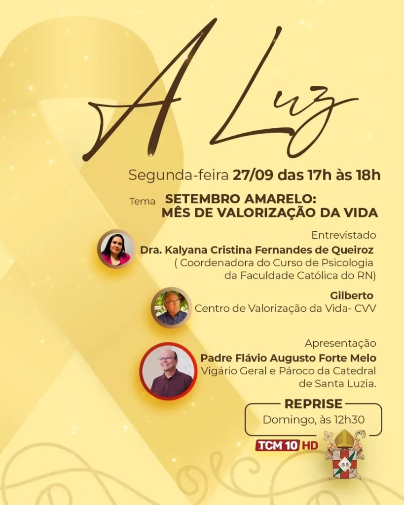Em prol da campanha “Setembro Amarelo “, que é dedicada a prevenção e conscientização contra o suicídio e valorização da vida, o programa A Luz da Diocese, convida para a edição desta segunda-feira, às 17h, pela TCM 10 HD]. Aguardamos por você!