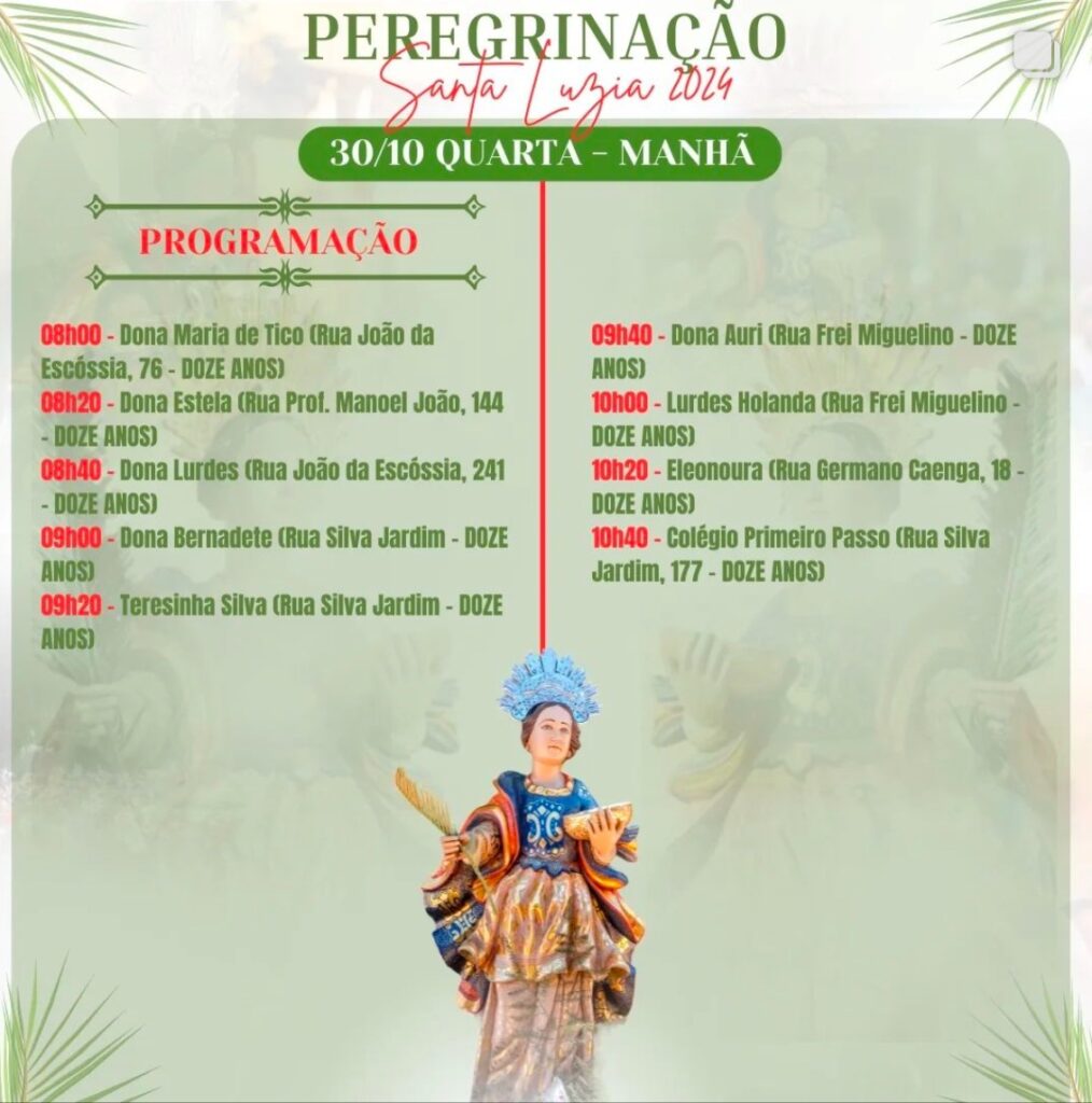 Veja a programação desta quarta-feira, dia 30, da peregrinação da Imagem e relíquia de Santa Luzia, em Mossoró-RN. Lembrete: Quem pediu para receber a imagem peregrina deve ficar atento a ligação da equipe de peregrinação para confirmar horário e endereço. Mais informações: 3321.3157