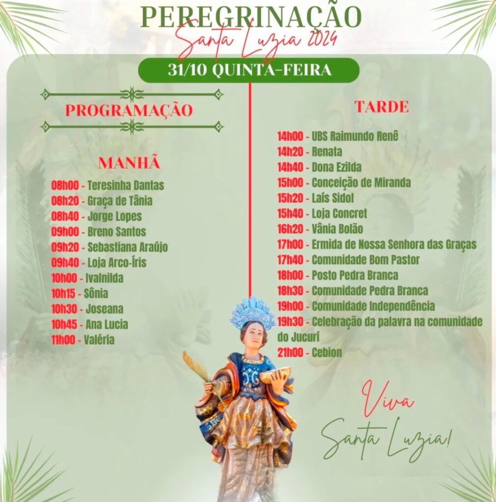 Veja a programação desta quinta-feira, dia 31, da peregrinação da Imagem e relíquia de Santa Luzia, em Mossoró-RN. Lembrete: Quem pediu para receber a imagem peregrina deve ficar atento a ligação da equipe de peregrinação para confirmar horário e endereço. Mais informações: 3321.3157