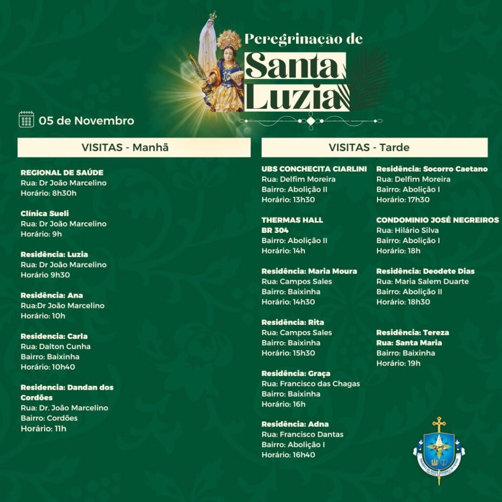 Veja a programação desta terça-feira, dia 05, da peregrinação da Imagem e relíquia de Santa Luzia, em Mossoró-RN. Lembrete: Quem pediu para receber a imagem peregrina deve ficar atento a ligação da equipe de peregrinação para confirmar horário e endereço. Mais informações: 3321.3157