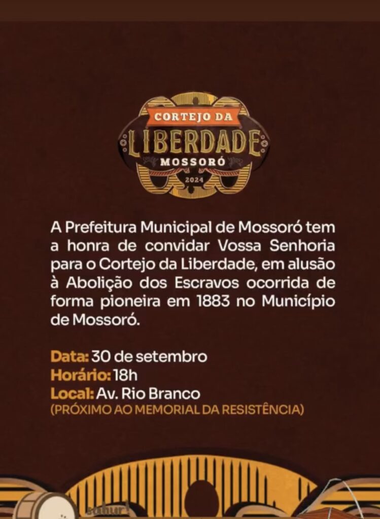 A Prefeitura Municipal de Mossoró tem a honra de convidar Vossa Senhoria para o Cortejo da Liberdade, em alusão à Abolição dos Escravos ocorrida de forma pioneira em 1883 no Município de Mossoró. Data: 30 de setembro Horário: 18h Local: Av. Rio Branco (PRÓXIMO AO MEMORIAL DA RESISTÊNCIA) Fonte: Prefeitura de Mossoró