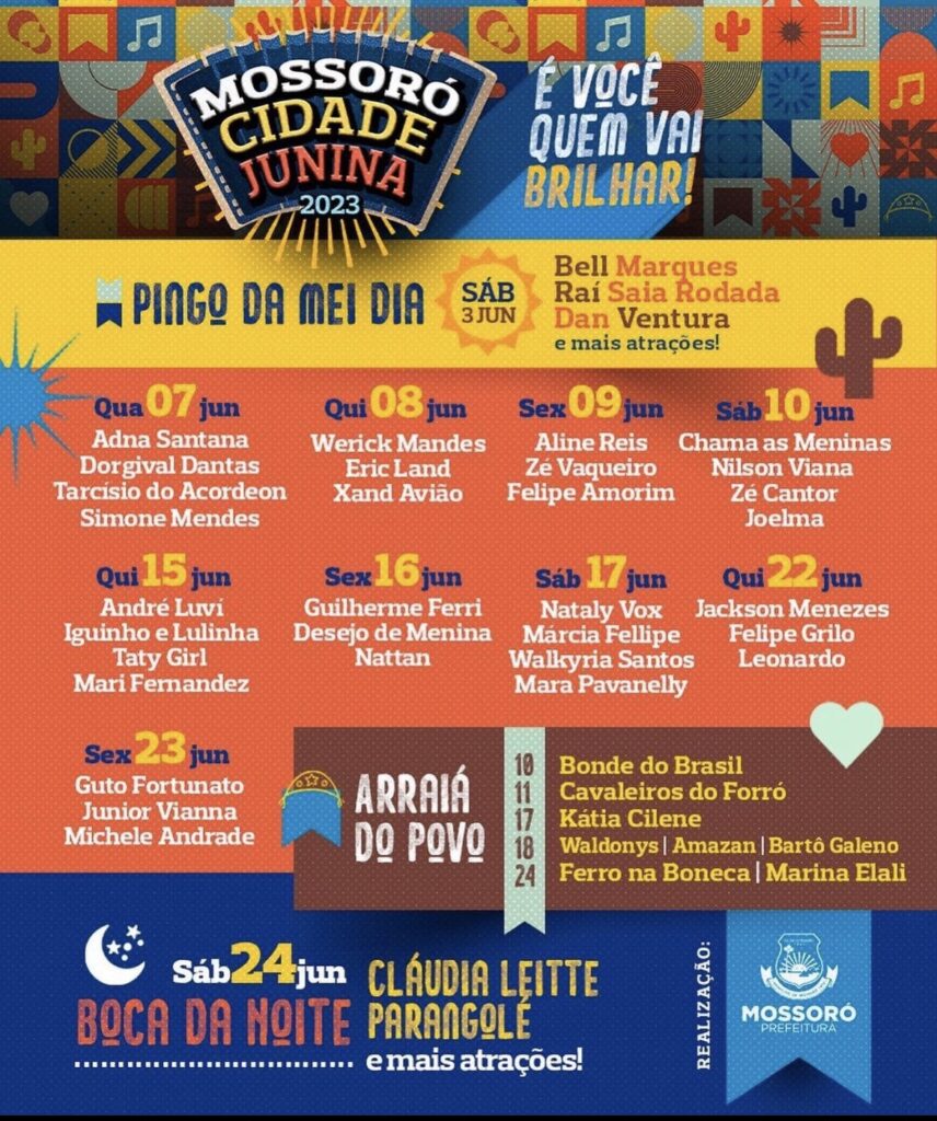 A Prefeitura de Mossoró, através da Secretaria Municipal de Cultura, divulgou nesta quinta-feira (11), a programação completa do Mossoró Cidade Junina 2023. O evento deste ano terá início no dia 3 de junho com o “Pingo da Mei Dia” e se estenderá até o dia 24 com o “Boca da Noite”. Ainda no dia 24, […]