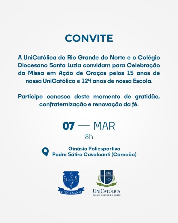 No próximo dia 7 de março, em comemoração aos 124 anos do Colégio Diocesano Santa Luzia e 15 anos da UniCatólica do RN, será celebrada uma Missa em Ação de Graças, às 8h, no Ginásio Carecão, presidida pelo Bispo Dom Francisco de Sales. Na oportunidade, havera uma especial homenagem ao poeta Antônio Francisco, agraciado com […]