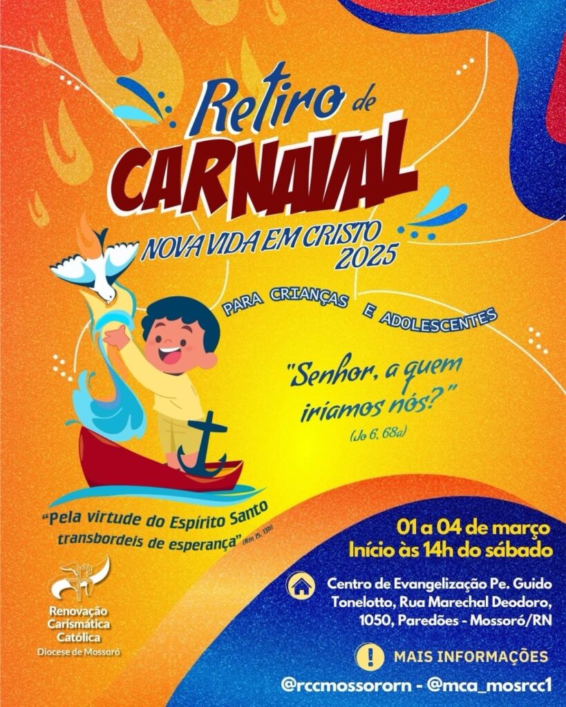 CRONOGRAMA DO NOVA VIDA EM CRISTO 2025*“Senhor, a quem iríamos nós?” (Jo 6, 68a) Sábado – Tarde14h – Terço do Espírito Santo (Ministério de Intercessão)14h30 – Louvor e oração15h – Pregação – PE. CLÓVIS – “Porque o amor de Deus foi derramado em nossos corações” (Rm 5,5b) (Amor de Deus)16h – Intervalo16h30 – Santa Missa […]