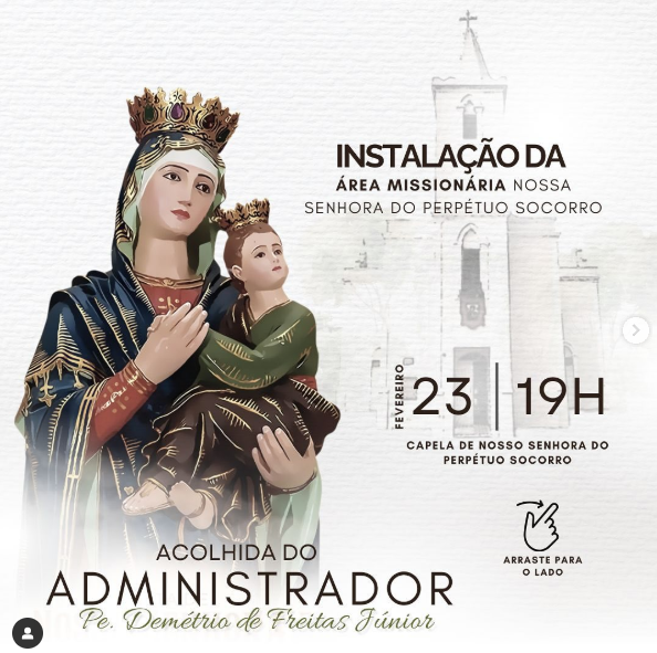 A Diocese de Mossoró convida para instalação da Área Missionária Nossa Senhora do Perpétuo Socorro e acolhida ao administrador, Pe @demetriofjr, neste domingo, dia 23, a partir das 19h, em Felipe Guerra (RN). Preside Dom Francisco de Sales, Bispo Diocesano.