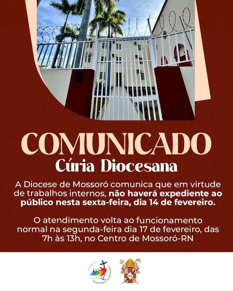 A Diocese de Mossoró comunica que em virtude de trabalhos internos, não haverá expediente ao público nesta sexta-feira, dia 14 de fevereiro. O atendimento volta ao funcionamento normal na segunda-feira dia 17 de fevereiro, das 7h às 13h, no Centro de Mossoró-RN