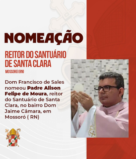 O Bispo Diocesano, Dom Francisco de Sales, O.Carm., anunciou na manhã desta quarta-feira, dia 12 de fevereiro de 2025, a nomeação de Pe Alison Felipe de Moura, como novo reitor do Santuário de Santa Clara, bairro Dom Jaime Câmara, em Mossoró (RN). Padre Alison é natural de Mossoró, e foi ordenado em 7 de […]