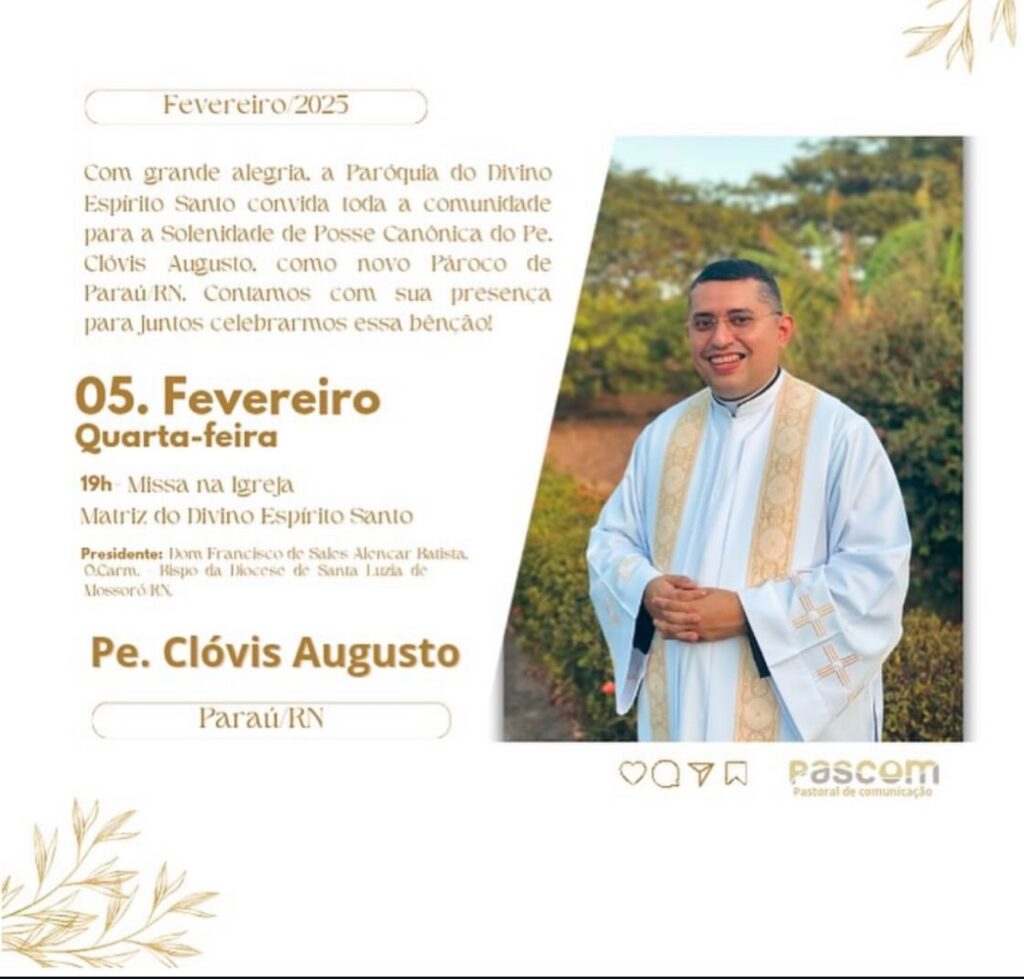 Com grande alegria, a Paróquia do Divino Espírito Santo convida toda a comunidade para a Solenidade de Posse Canónica do Pe. Clóvis Augusto, como novo Pároco de Para RN. Contamos com sua presenca para juntos celebrarmos essa bênção!