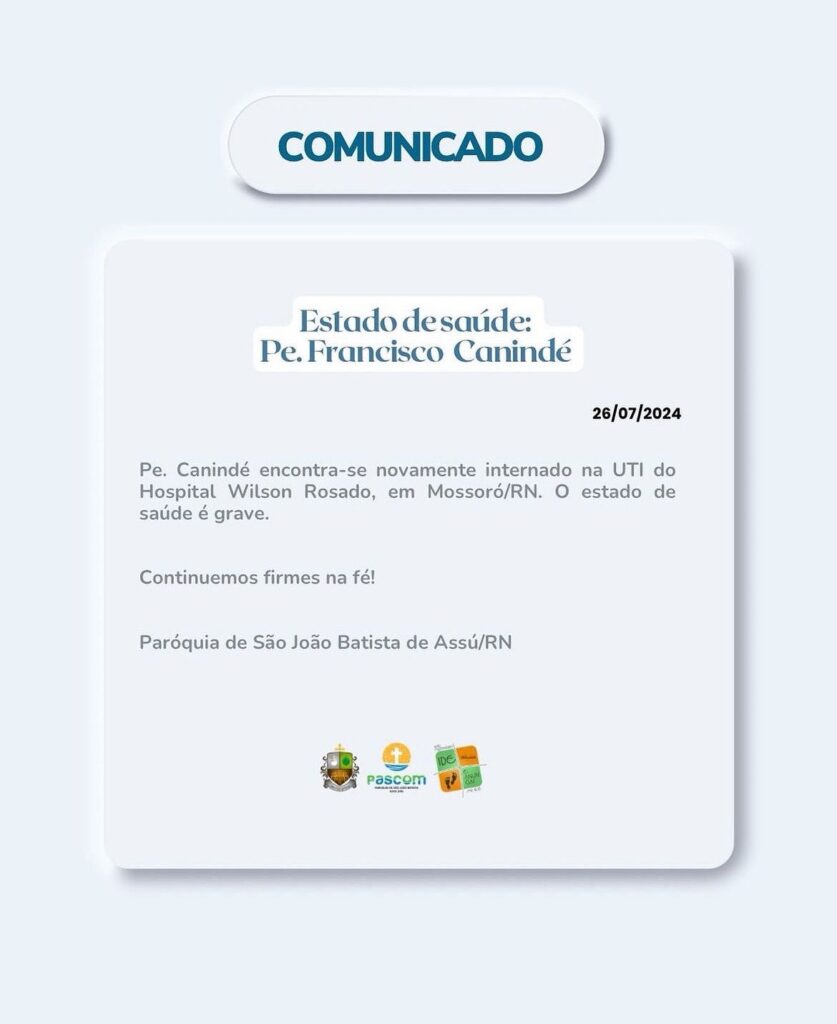 Pe. Canindé encontra-se novamente internado na UTI do Hospital Wilson Rosado, em Mossoró/RN. O estado de saúde é grave. Continuemos firmes na fé! Paróquia de São João Batista de Assú/RN