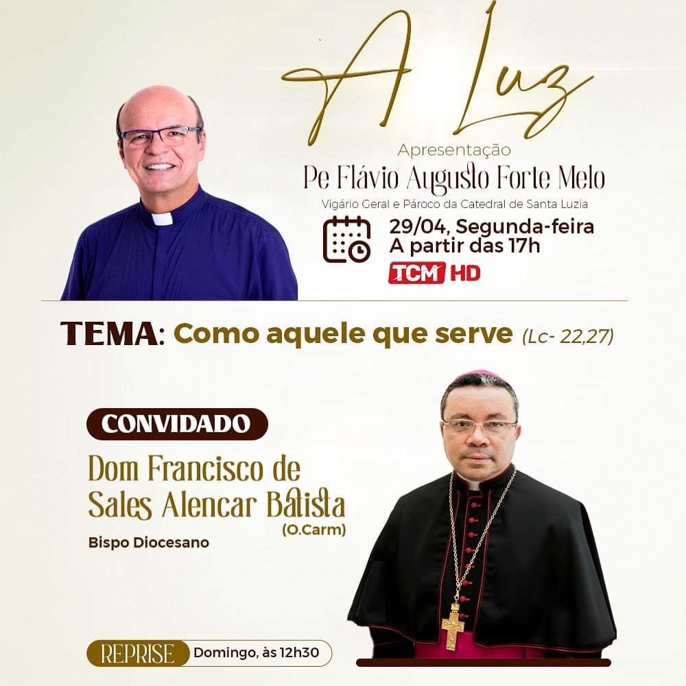 O nosso bispo Diocesano, Dom Francisco de Sales , O.Carm., será entrevistado desta segunda-feira, dia 29, no programa A Luz da Diocese de Mossoró pela @tcmtelecom. Será a primeira entrevista ao programa A Luz depois de sua posse como sétimo bispo da Diocese no dia 17 de fevereiro deste ano. Imperdível! Apresentação: Padre Flávio Augusto […]
