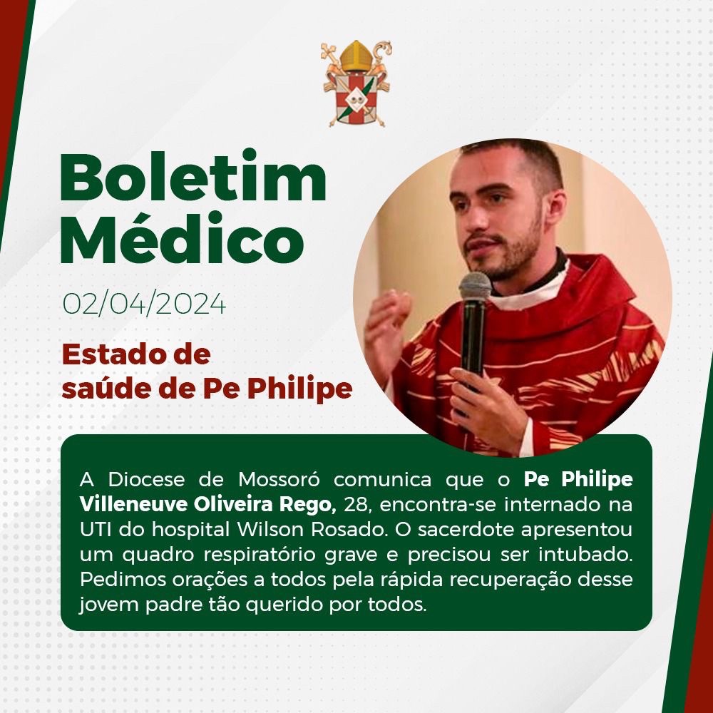A Diocese de Mossoró comunica que o Pe Philipe Villeneuve Oliveira Rego, 28, encontra-se internado na UTl do hospital Wilson Rosado. O sacerdote apresentou um quadro respiratório grave e precisou ser intubado. Pedimos orações a todos pela rápida recuperação desse jovem padre tão querido por todos. Novo Boletim A Diocese de Mossoró informa que o […]