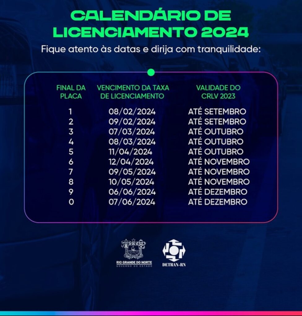 O Calendário de Licenciamento de Veículos para o ano de 2024 foi divulgado nesta sexta-feira (22) pelo Departamento Estadual de Trânsito do RN (Detran). A taxa alcança toda a frota de veículos do Rio Grande do Norte (1.546.000) e tem os seus primeiros vencimentos programados para o mês de fevereiro de 2024, contemplando as placas finais 1 e 2.