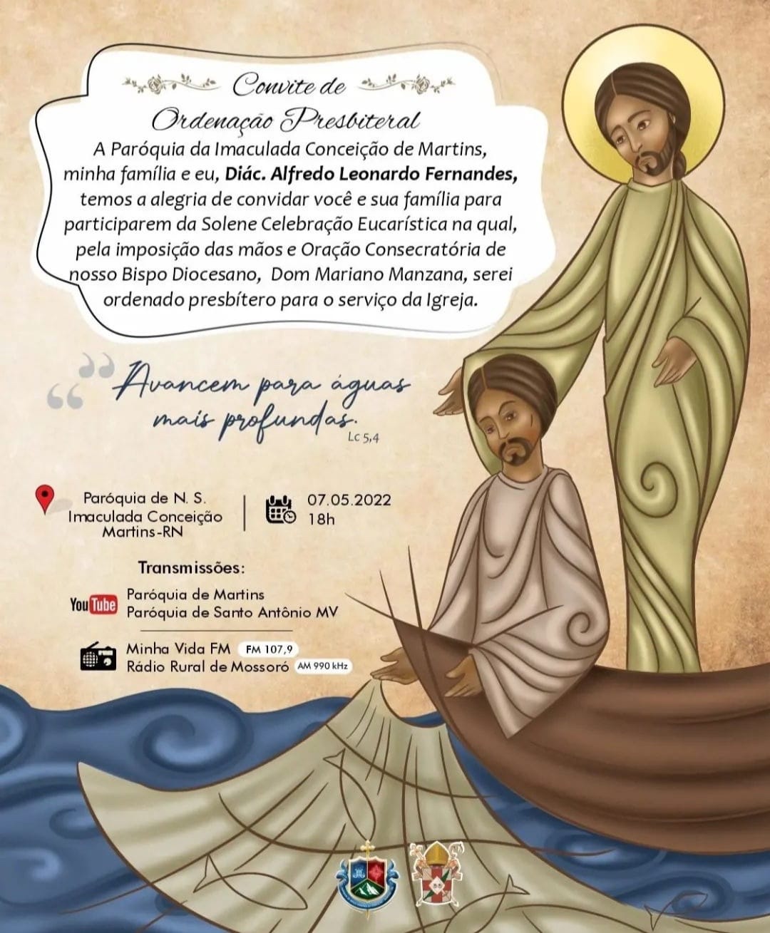 No próximo sábado, dia 07, às 18h, na Paróquia de Martins, a Diocese de Mossoró vai ordenar, o diácono Alfredo Leonardo Fernandes, sob a imposição das mãos do bispo Dom Mariano Manzana, mais um padre para serviço da Igreja.
