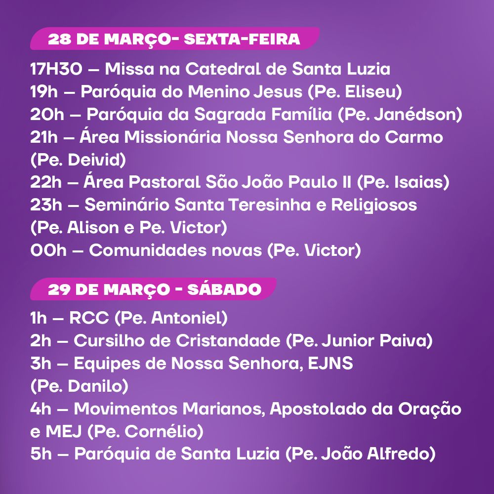 A Forania de Mossoró convida fiéis para a celebração das “24 Horas para o Senhor”, marcada para os dias 28 e 29 de março na Catedral. Esta iniciativa, proposta pelo Papa Francisco para Ano Jubilar, é um convite à oração, penitência e especialmente ao sacramento da reconciliação, em um período dedicado à reflexão e ao encontro espiritual.