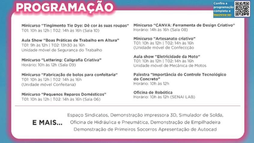 Abriremos o evento com a Palestra “Inovação e Criatividade, Por que não?”, ministrada por Paulo Miranda, Diretor do SEBRAE Mossoró. Durante o evento serão ofertados cursos e oficinas totalmente gratuitas.