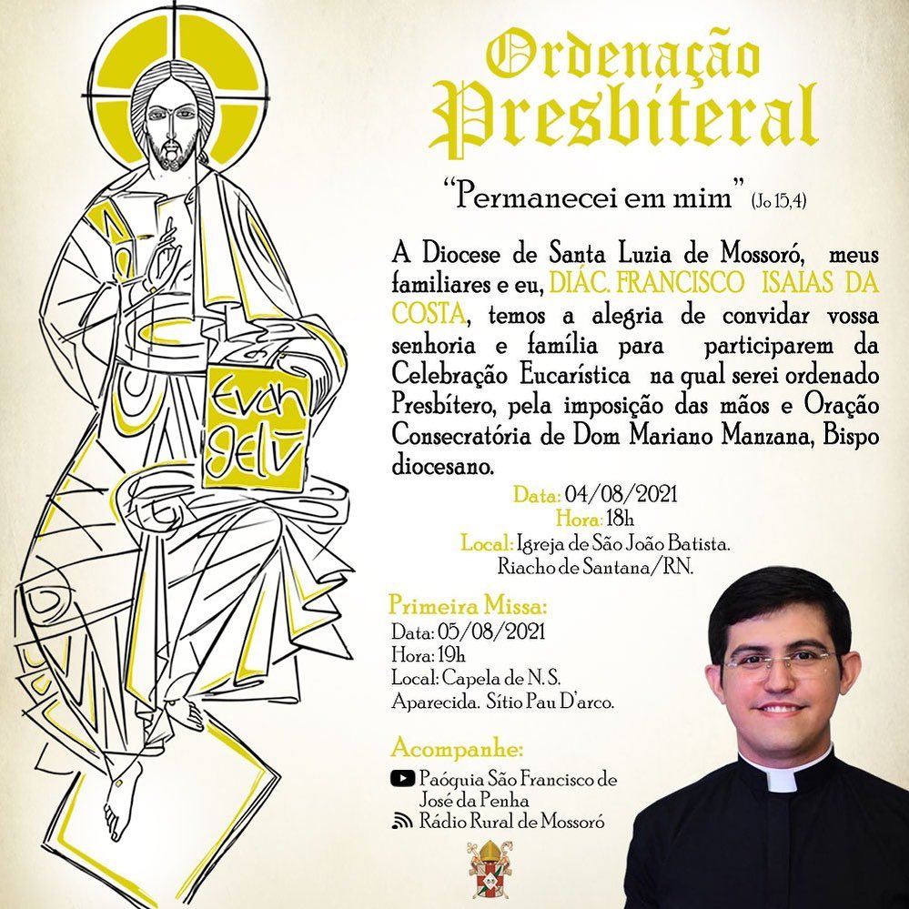 Nesta alegria, convido você e sua família para participarem da Celebração Eucarística na qual serei ordenado presbítero.