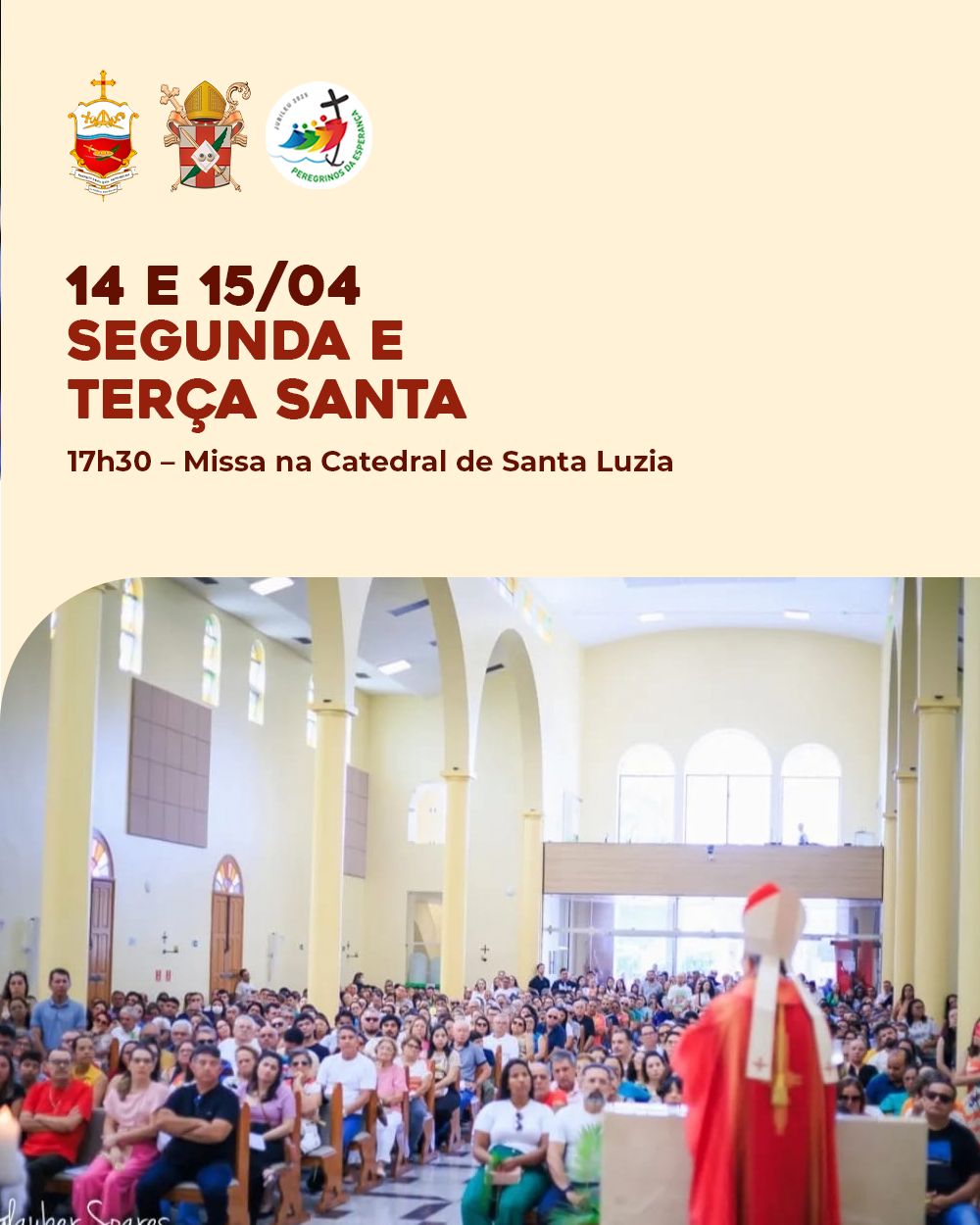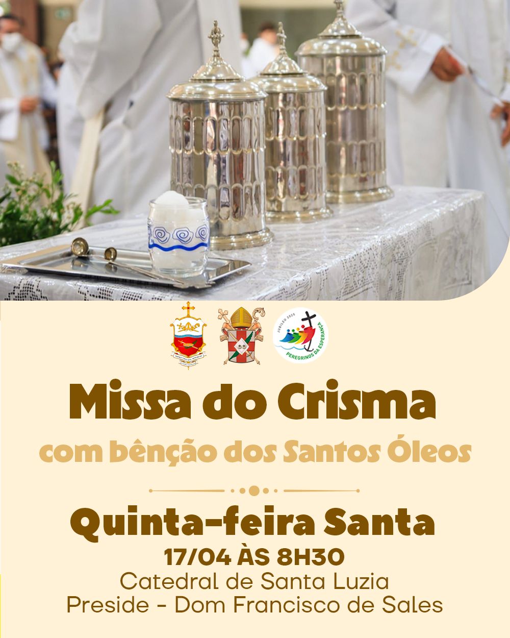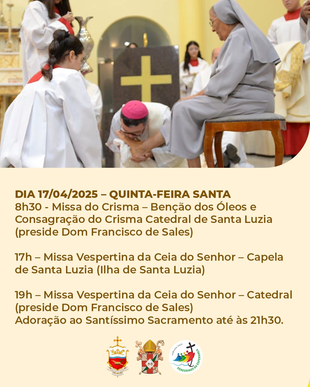A Diocese divulga hoje a programação da Semana Santa 2025, com as celebrações que serão presididas pelo Bispo Diocesano, Dom Francisco de Sales, na Catedral de Santa Luzia.