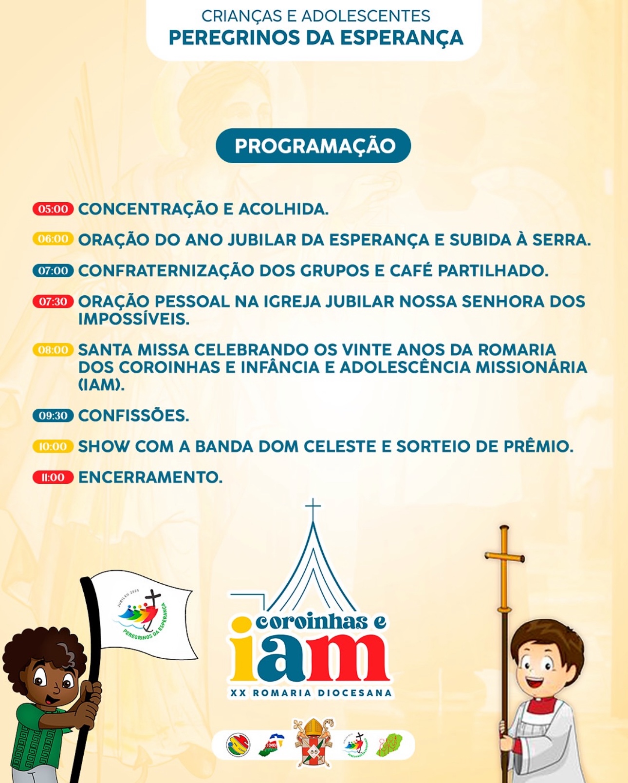 Romaria dos Coroinhas e da Infância e Adolescência Missionária (IAM), que acontecerá no dia 01 de maio. Celebramos, de forma especial, os 20 anos da nossa romaria, que este ano se insere no contexto do Ano Jubilar da Esperança. Inspirados pelo convite do Papa Francisco a meditar sobre a esperança, definimos como tema para nossa romaria: “Crianças e Adolescentes, peregrinos da Esperança”.
