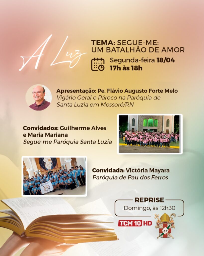 Programa A Luz da Diocese de Mossoró – 17h às 18h. Tema de hoje (18):Segue-me: Um Batalhão de Amor Apresentação- Pe Flávio Augusto Forte Melo Site- tcmplay.tv.br ( ao vivo) Municípios que já contam com a TCM- Assu, Campo Grande, Apodi, Caraúbas, Felipe Guerra e Governador Dix-Sept Rosado. Reprise-Domingo- às 12h30 e as segundas- às […]